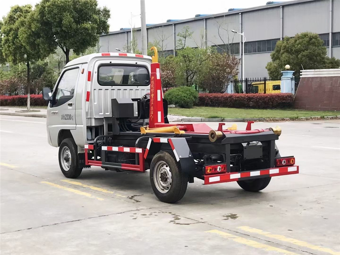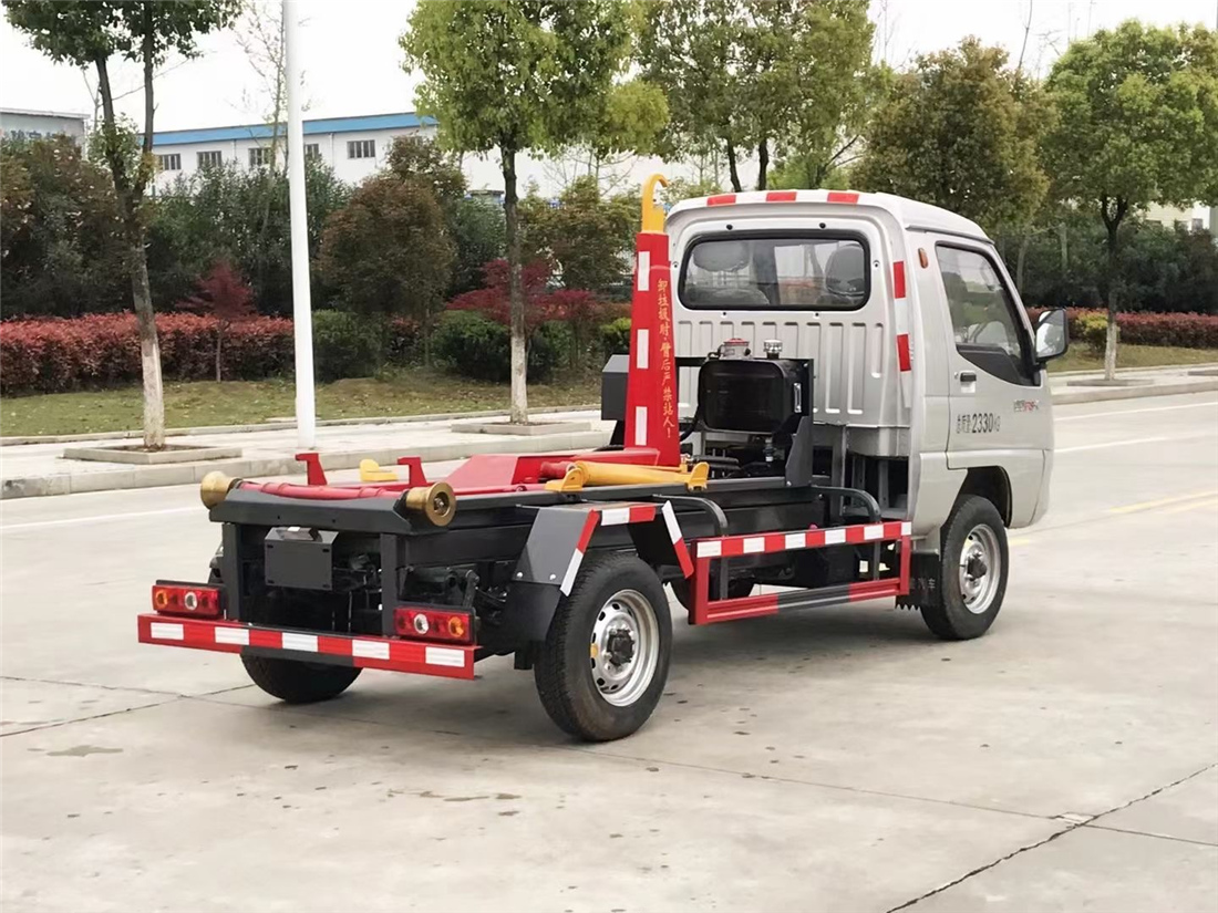該款鉤臂式垃圾車由液壓系統、操作系統組成。舉升油制缸(1支)系國內知名液壓件廠家生產的雙作用油缸。垃圾廂可自吊上放下,可自行傾倒垃圾,上下一次工作循環時間≤50S。該車的特點是一個車能配多個垃圾廂,能實現一臺車與多個垃圾廂聯合作業,循環運輸,充分提高了車輛的運輸能力。