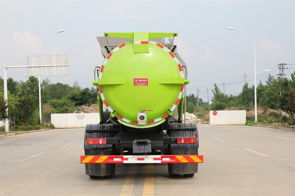 上裝配置:罐體容積10m3,配備120L/240L掛桶提升翻轉機構,液壓系統,后蓋液壓鎖緊開啟,罐體可以舉升自卸,尾部帶自流閥;用于運輸液態垃圾,其特點操作簡單,密封性好,無泄漏,無異味;可選裝固液分離功能,推板擠壓功能,常用于餐館的垃圾轉運處理。